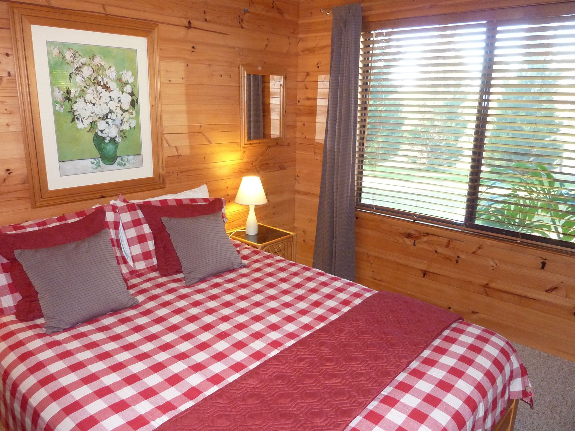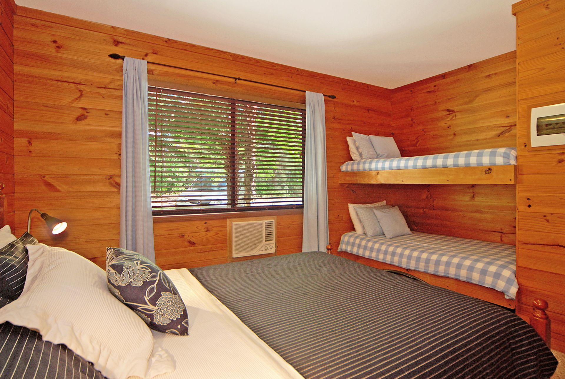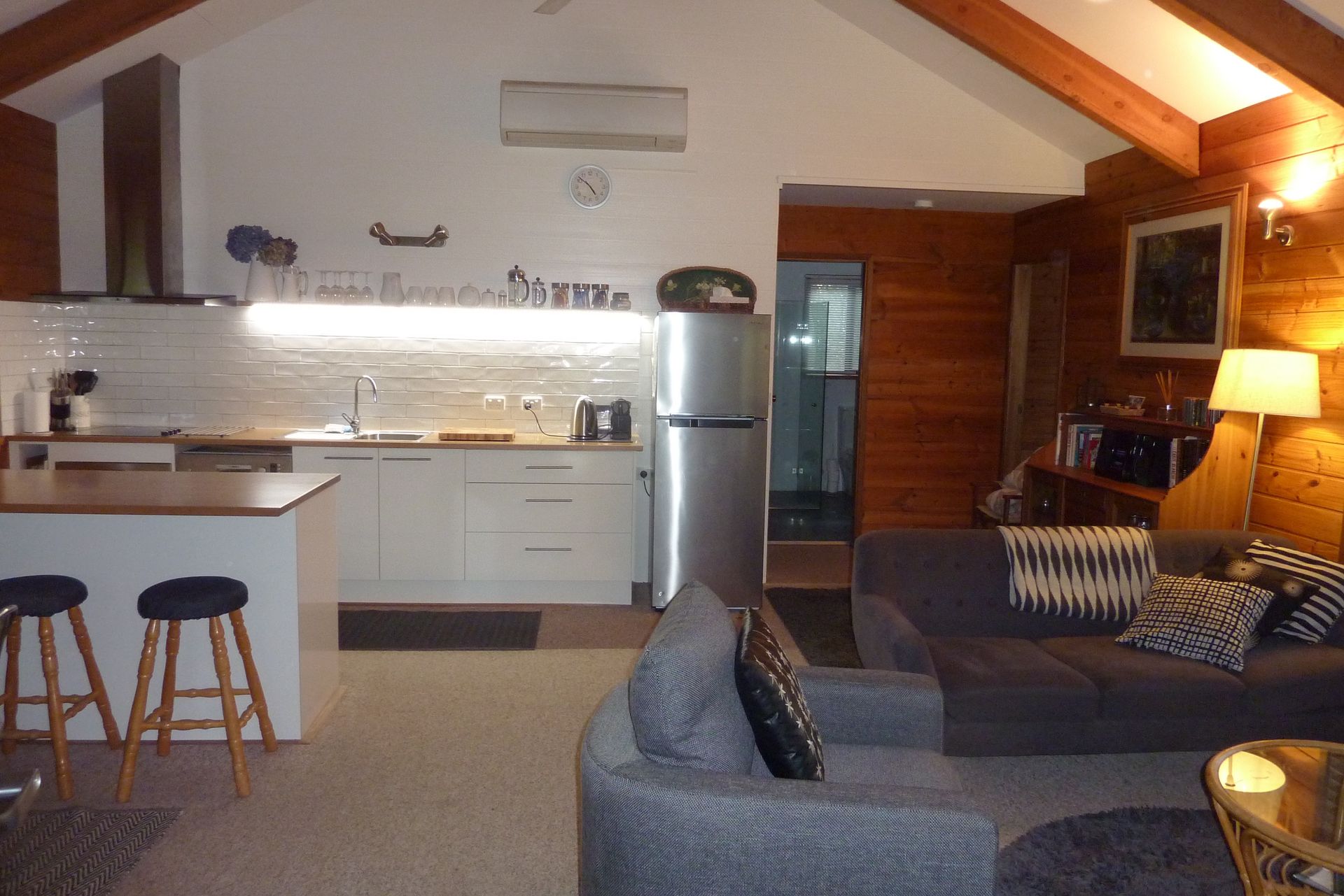 We can accommodate up to 6 persons with bedding comprising queen beds in both main and second bedroom, where there are also 2 additional bunks. The modern kitchen is fully equipped and the living room is open plan leading onto the deck with its expansive views. The cabin has split-system air-conditioning for comfort in all climates. There is everything you will need at Blue Gums Cottage for that special get-away either as a couple or family.