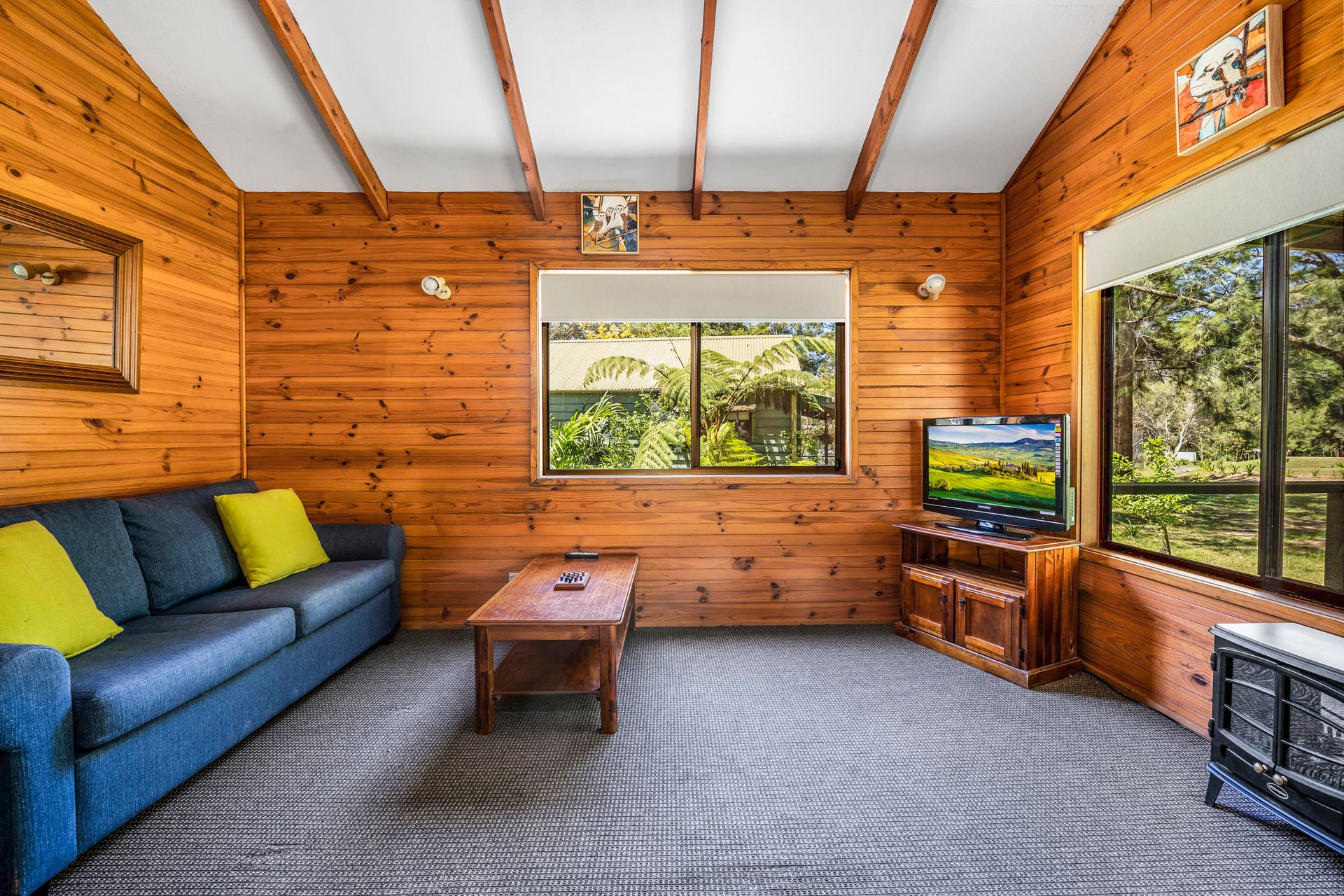 The cabin has a queen bedroom and the open plan living area has a comfy lounge and a smart TV. The lounge also folds out to a double sofa bed.