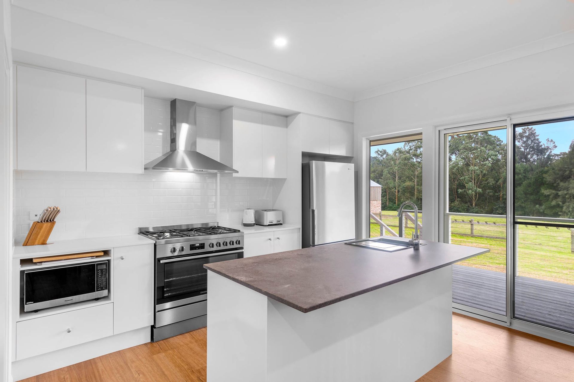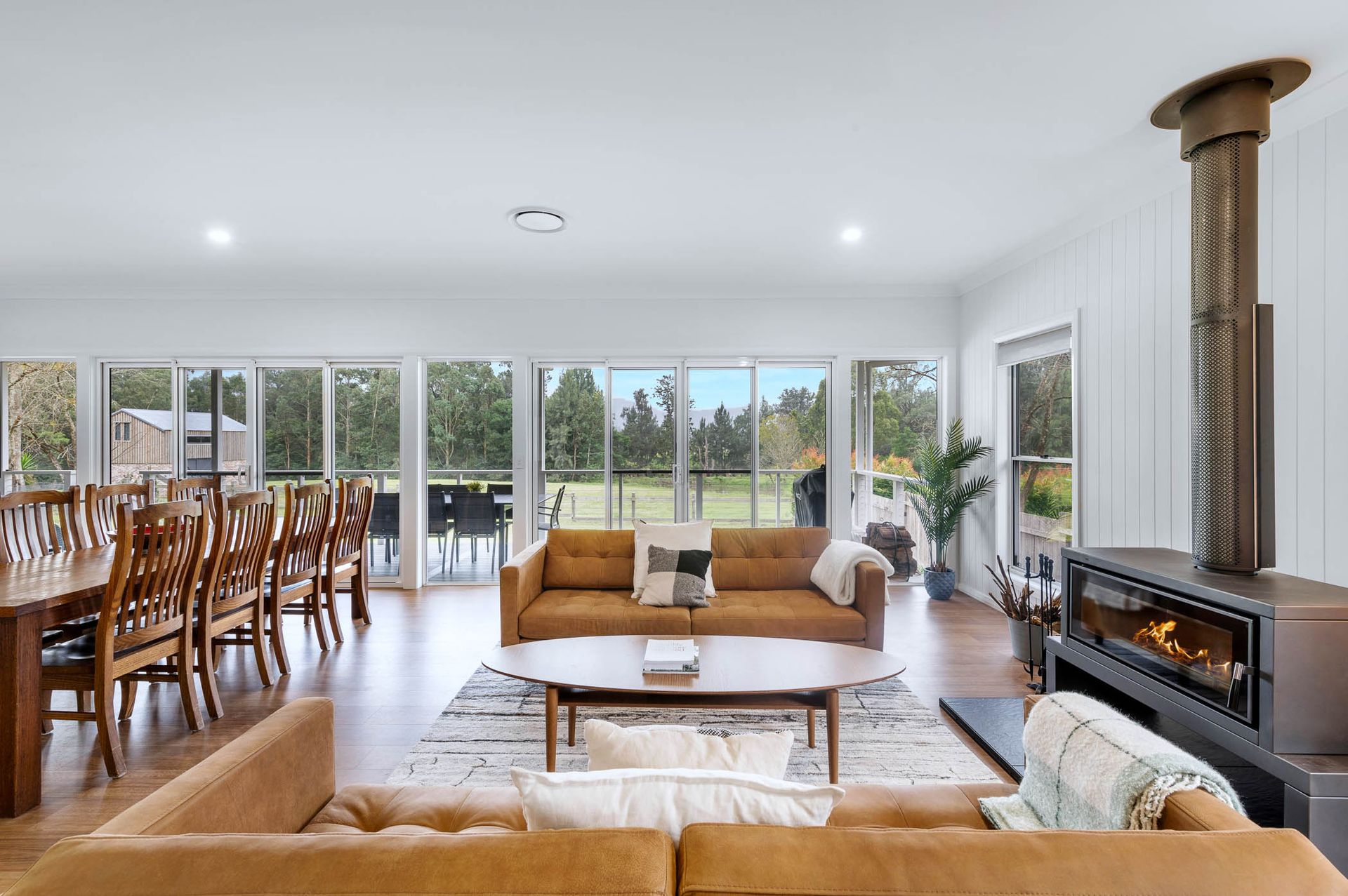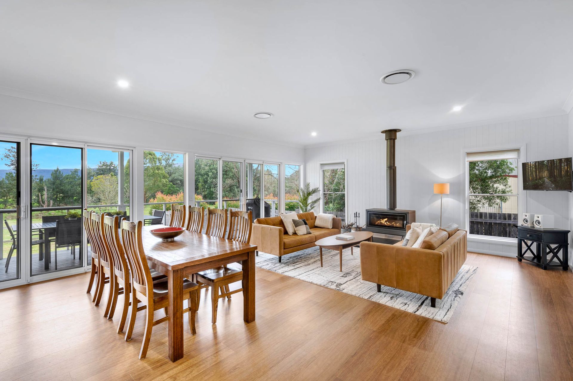 The open plan living area is full of light with large glass sliding doors opening up onto the veranda. Guests can enjoy a glass of wine while sitting in front of the slow combustion wood fireplace (wood provided May - September) and their comfort is assured year round with ducted reverse cycle air-conditioning throughout the property.