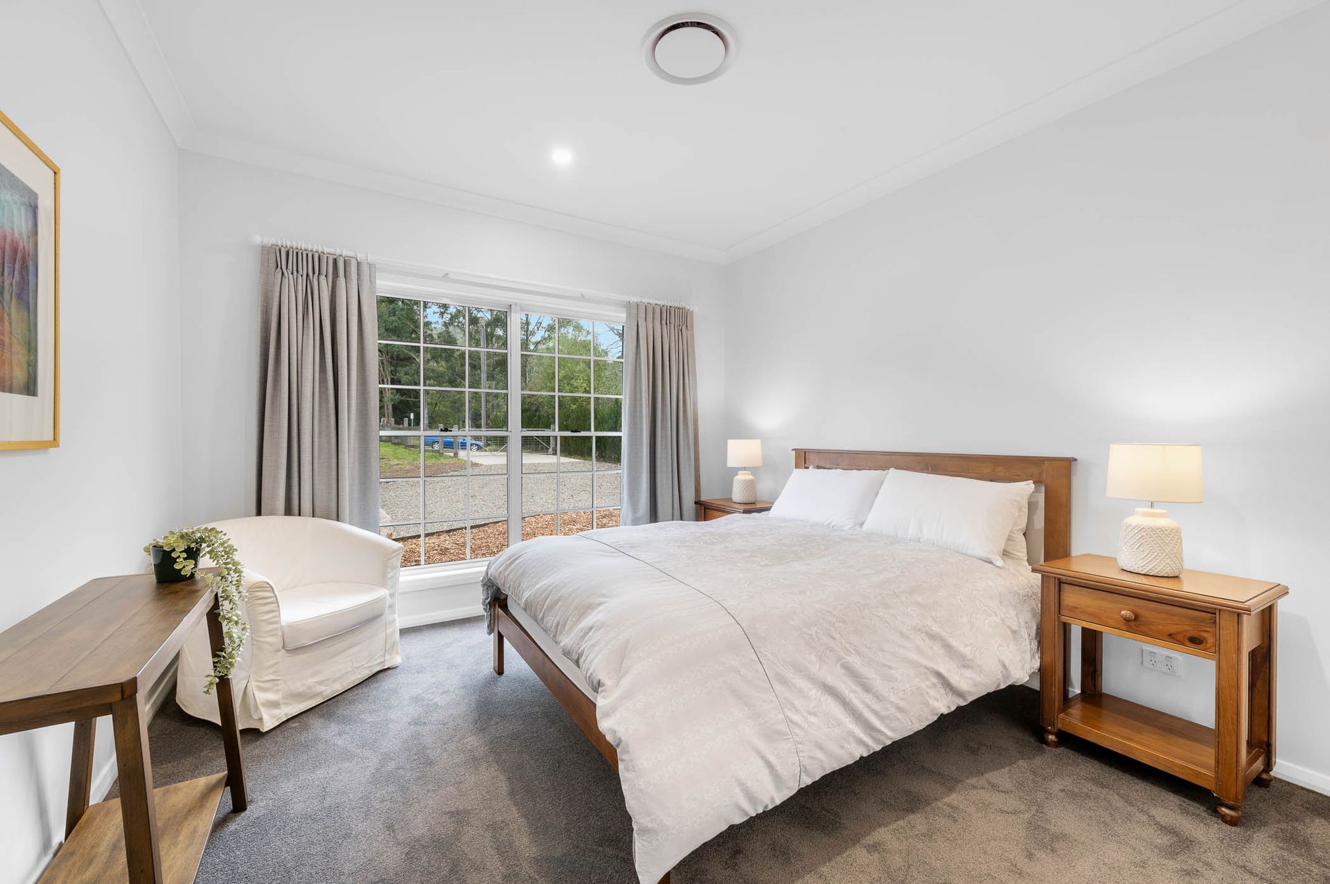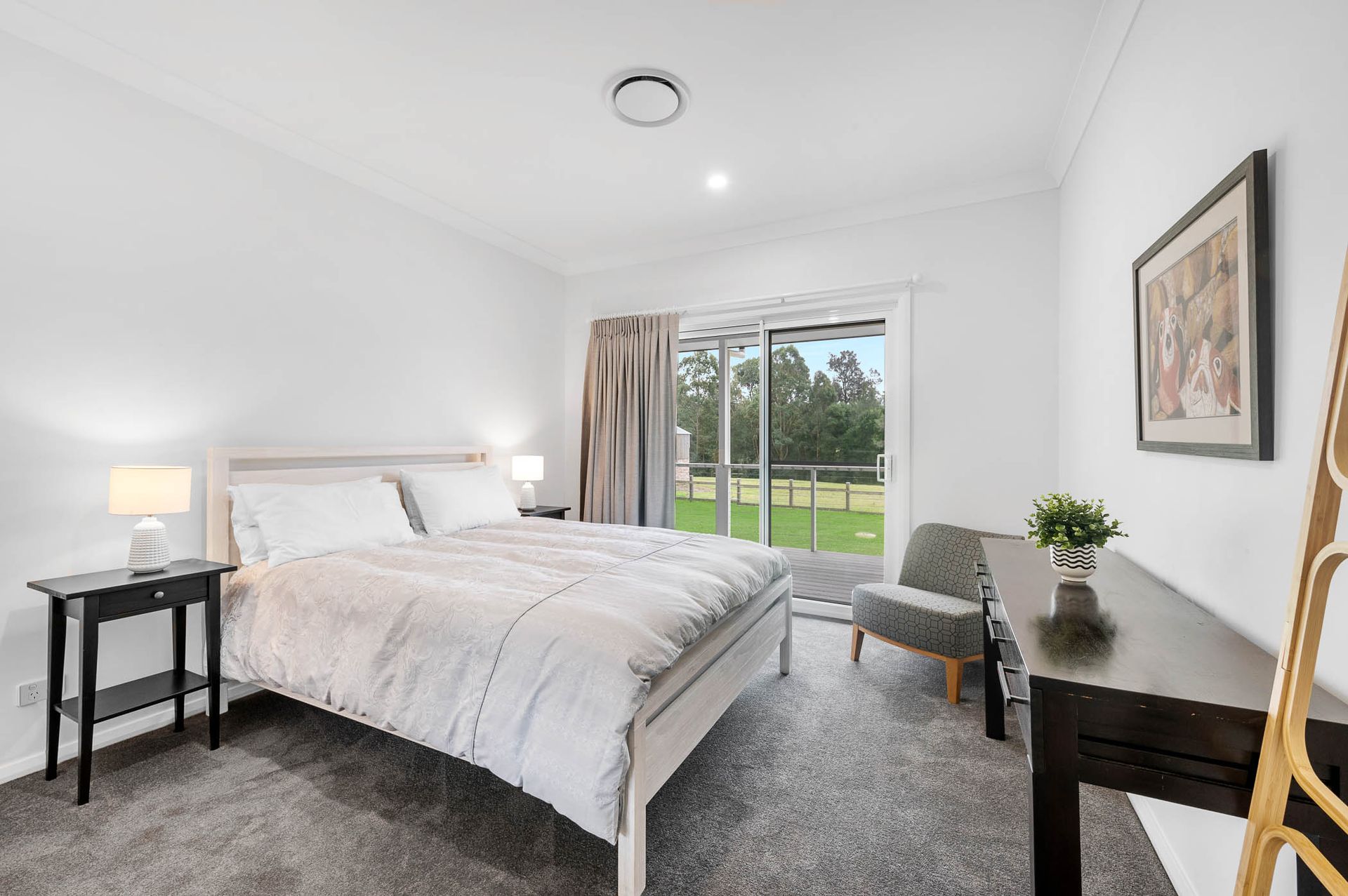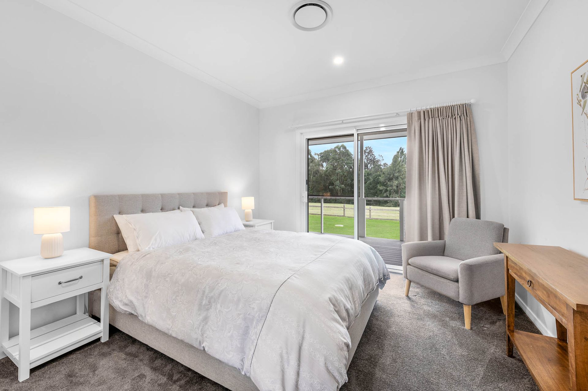 The open plan living area is full of light with large glass sliding doors opening up onto the veranda. Guests can enjoy a glass of wine while sitting in front of the slow combustion wood fireplace (wood provided May - September) and their comfort is assured year round with ducted reverse cycle air-conditioning throughout the property.