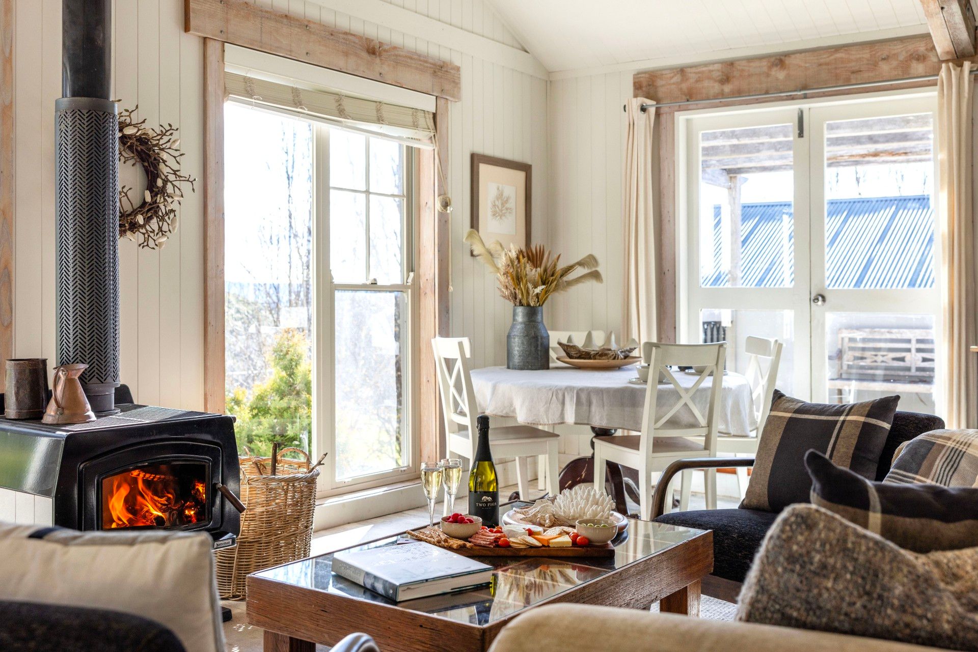 The open plan lounge/dining area has a slow combustion fire, air-conditioning and a smart TV.