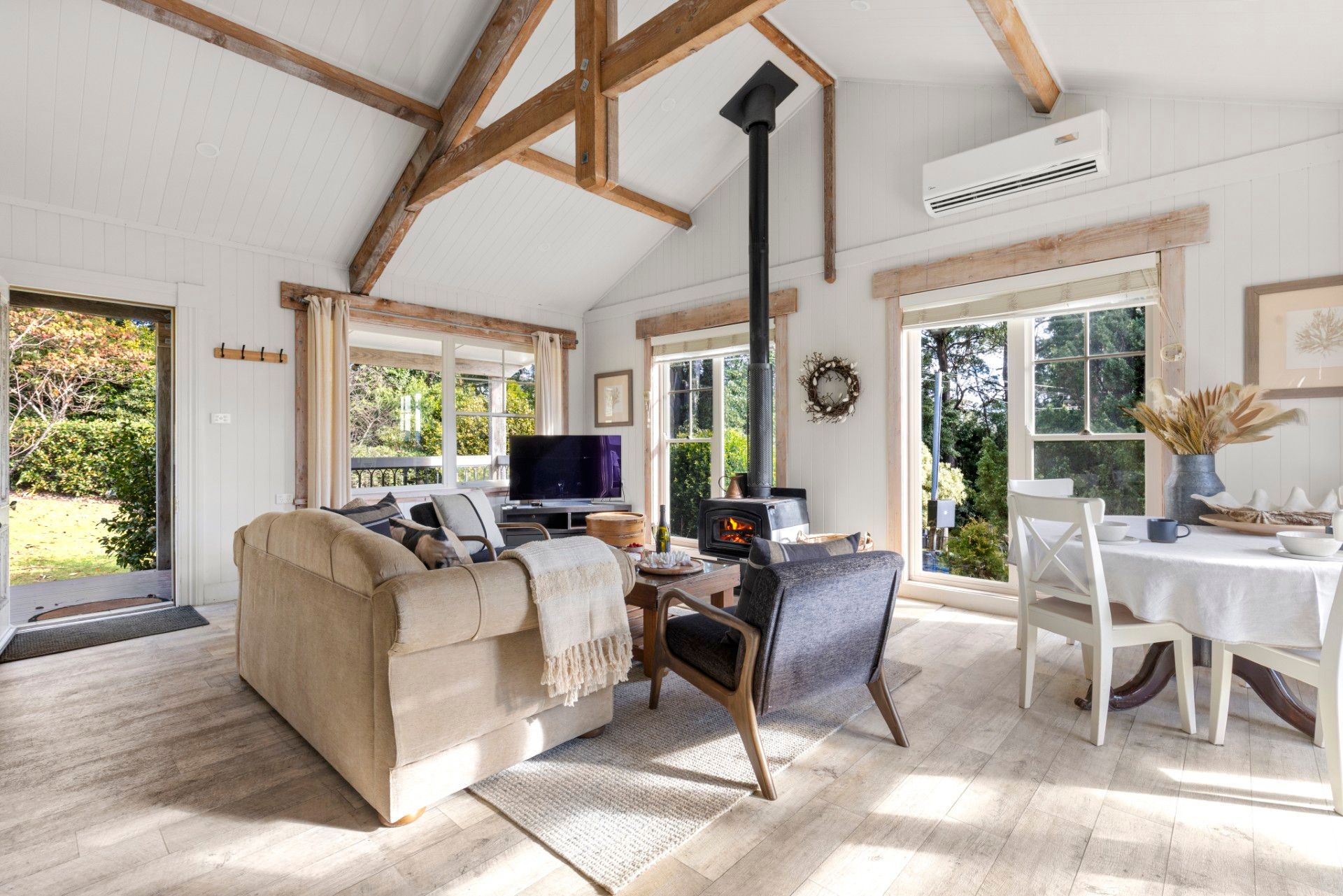 The main lounge area has comfy lounges where you can curl up in front of the open fireplace and guests comfort is assured year round with geothermal underfloor heating and reverse cycle AC. The adjoining sunroom and upstairs library are perfect spots for reading or quiet moments.