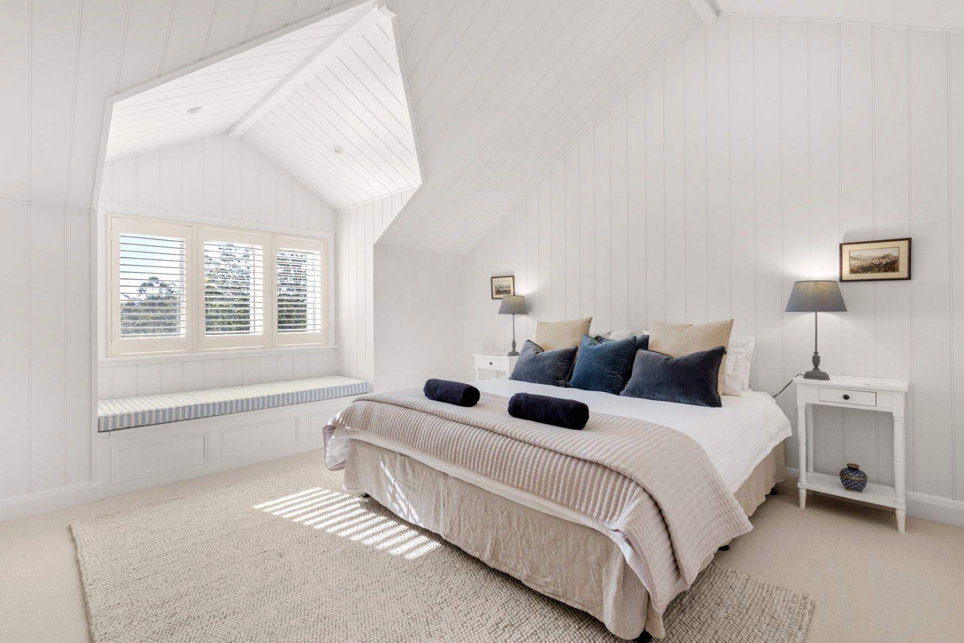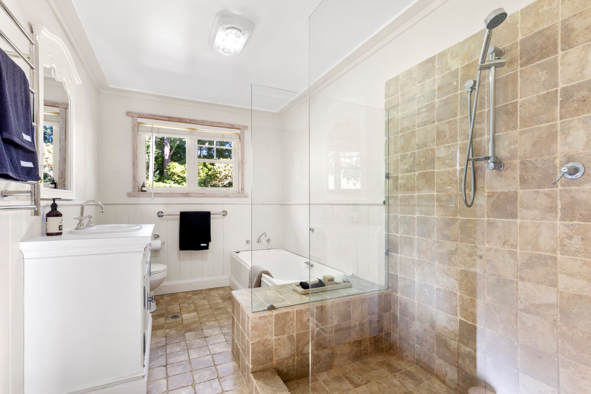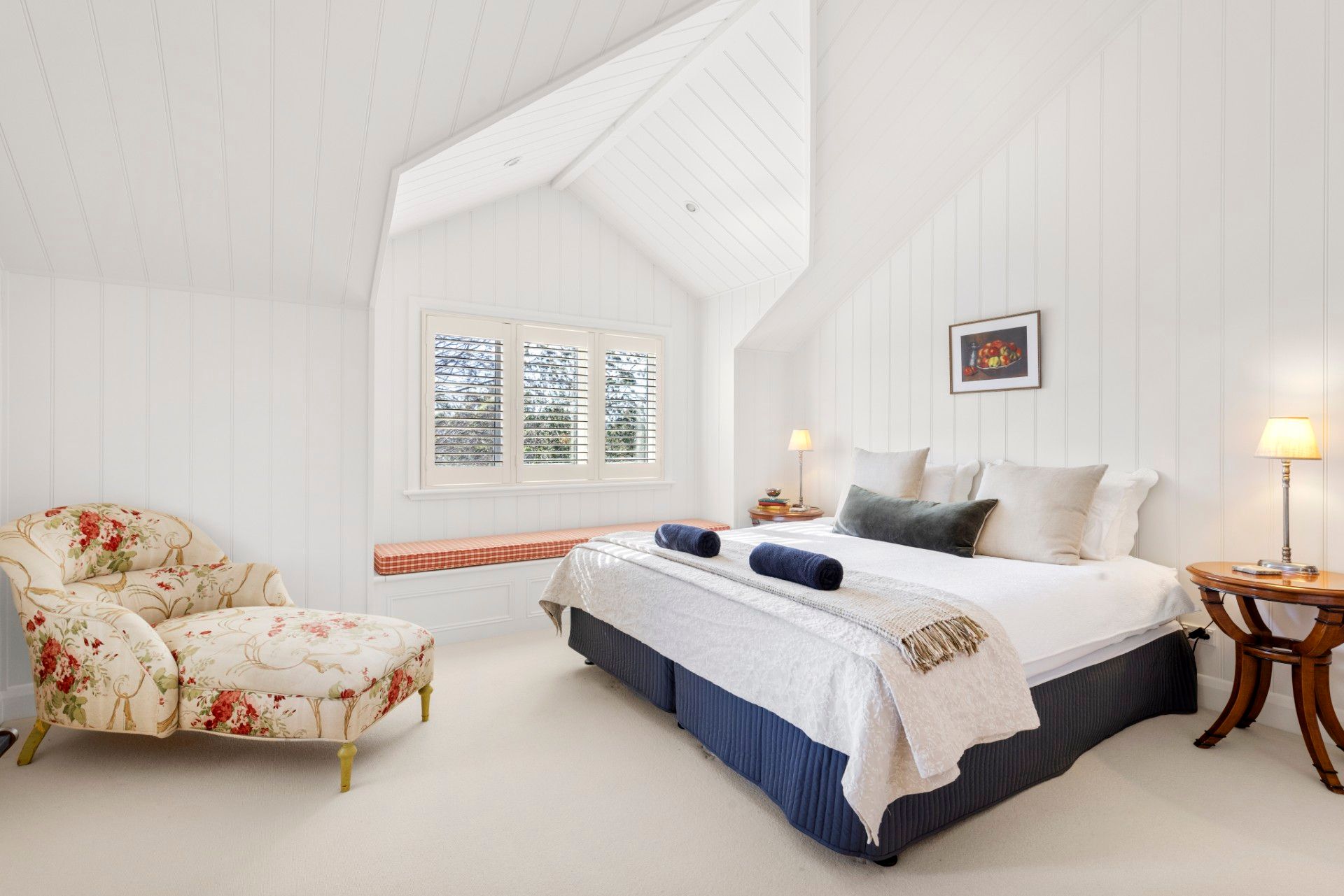 The large fully equipped kitchen has a Falcon stove, a separate butler’s pantry, dishwasher and a large food prep island. The main lounge area has comfy lounges where you can curl up in front of the open fireplace. Guests comfort is assured year round with geothermal underfloor heating and reverse cycle AC.The adjoining sunroom and upstairs library are perfect spots for reading or quiet moments.