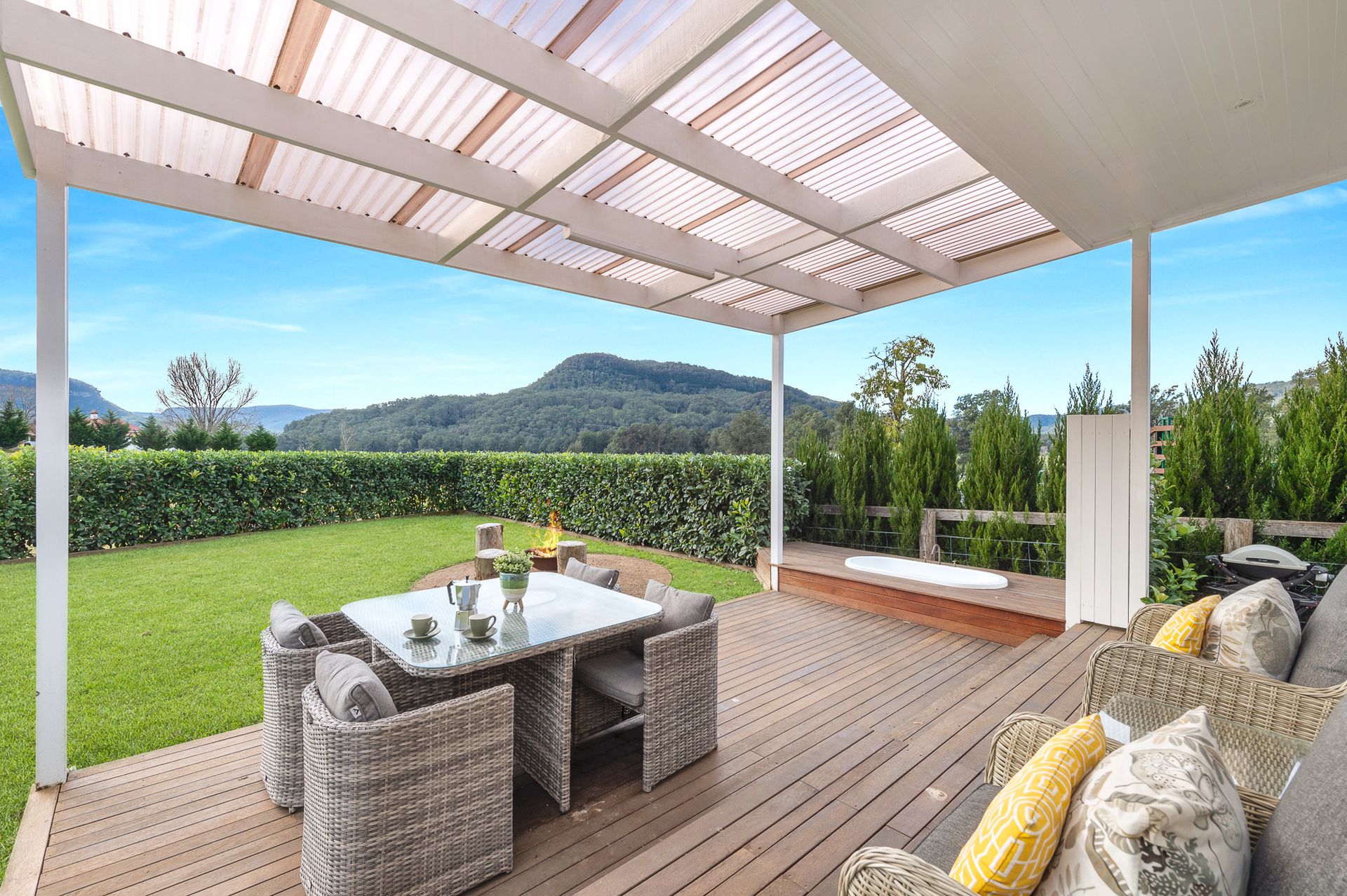 The Cottage has a fantastic outdoor area where guests can enjoy the stunning views. Guests can just sit back and relax on comfortable arm chairs, cook up a meal on the Webber BBQ or sit around the fire pit and take in the countless stars at night. Our favourite feature though is the wonderful built in outdoor bath!