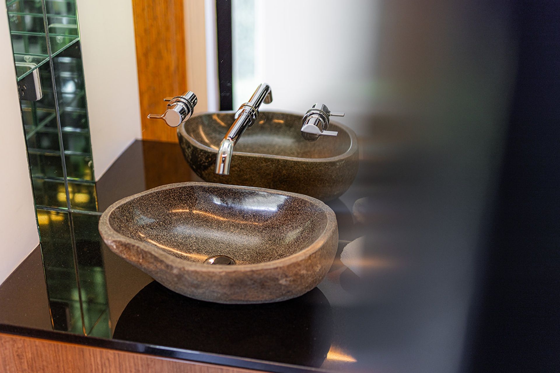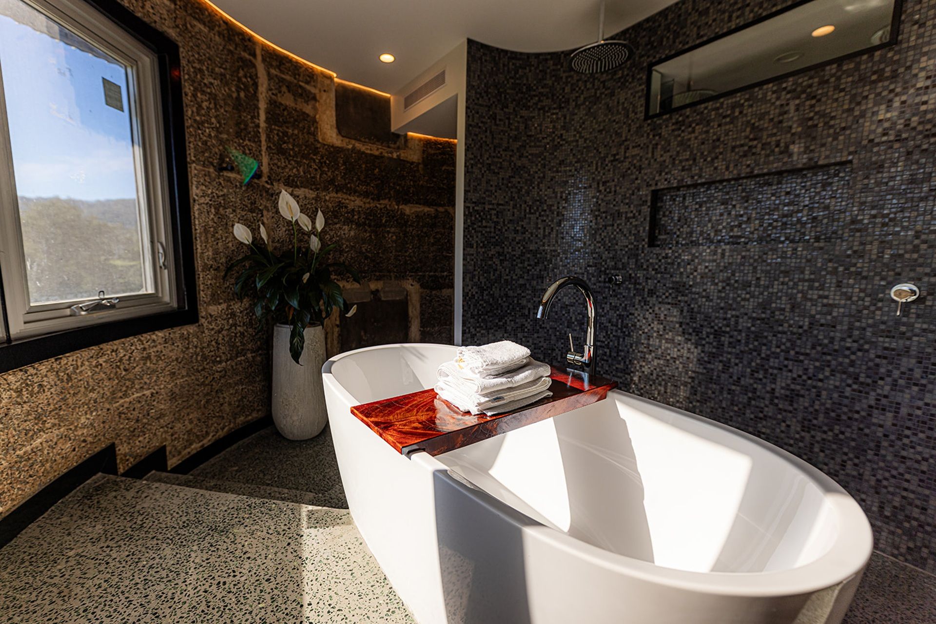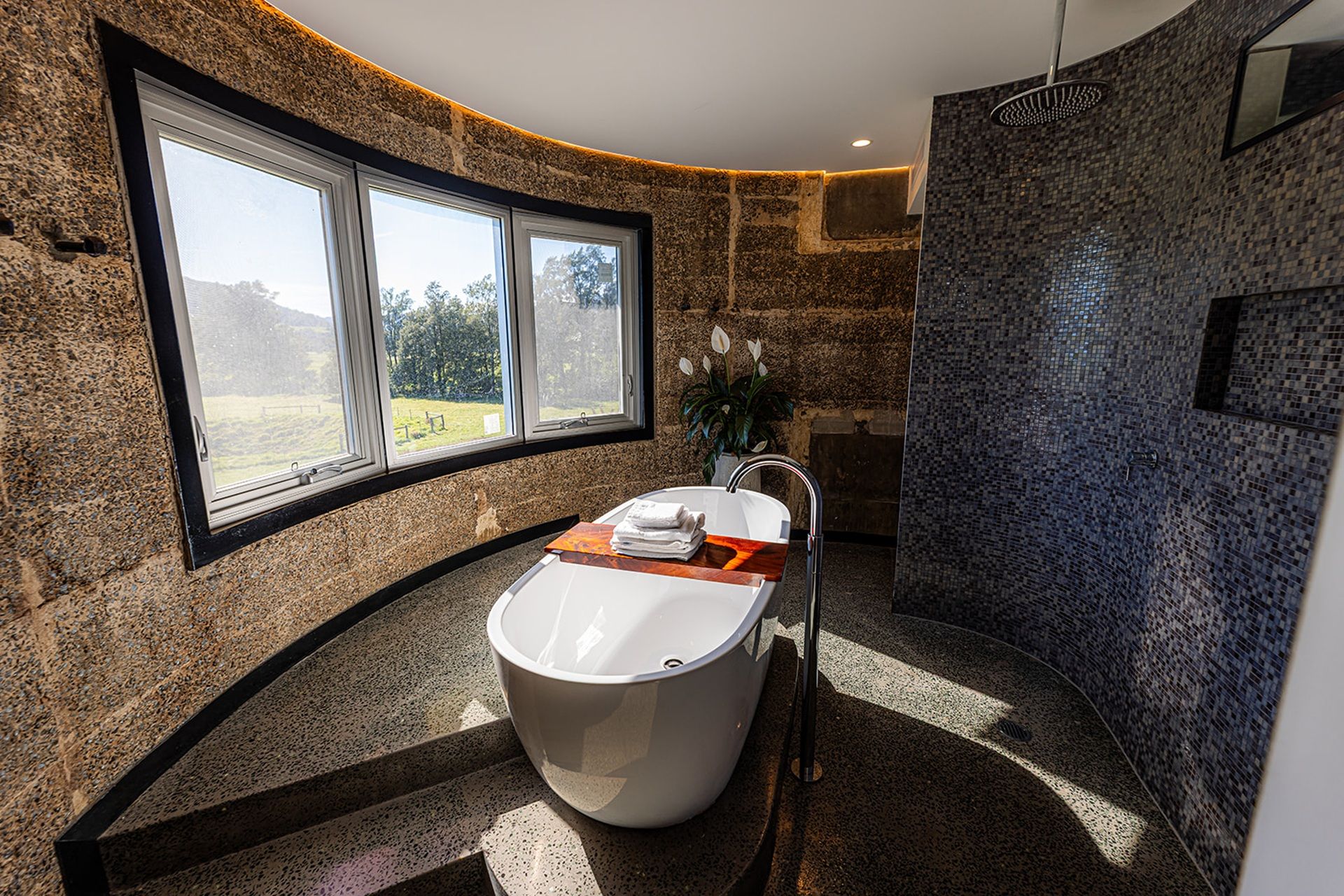Ascend the striking staircase, following the curve of the silo’s concrete walls, to find a spectacular bathroom. A luxurious freestanding bath sits beside a large picture window, offering breathtaking views. The bathroom also features a double rain shower and separate toilet.